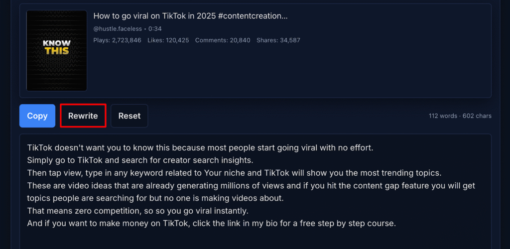 Once you’ve found viral examples, use Transcriptik’s Rewrite feature to instantly rephrase them into new, original versions.
