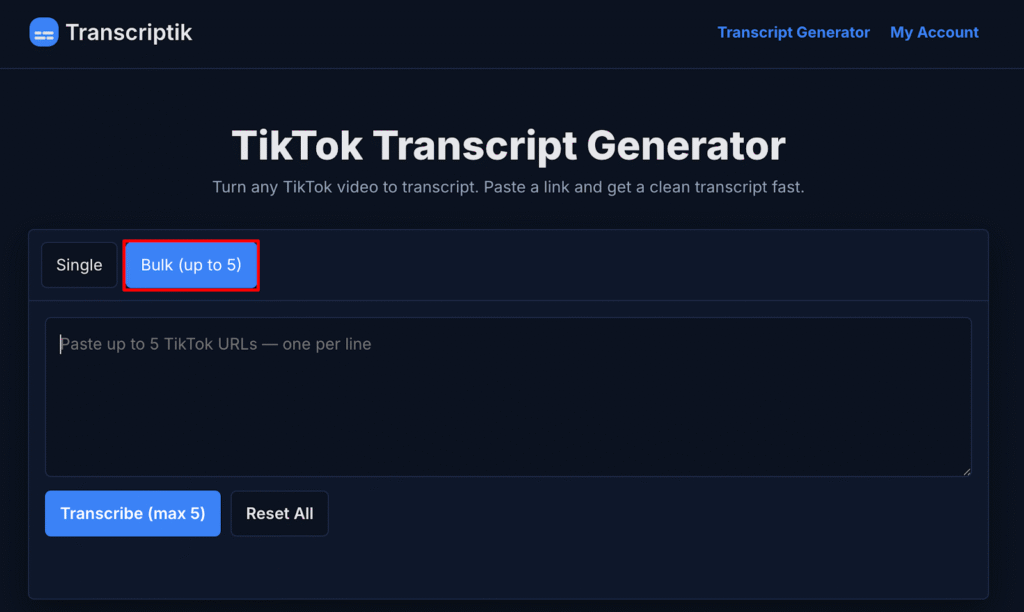 The Bulk mode helps creators analyze multiple viral TikToks at once, perfect for building a content strategy or automation workflow.